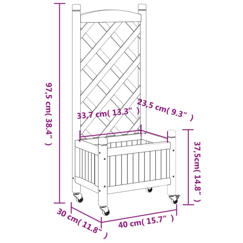 Тази дървена кашпа с пергола и колелца е отличен избор за увивни растения във вашата градина, вътрешен двор и тераса. Масивна ела: Масивната ела е красив и издръжлив материал, който запазва целостта си дори когато е изложен на влага. Не изсъхва и не се деформира, което я прави надежден избор.Достатъчно пространство: Тази градинска кашпа е достатъчно широка и дълбока, осигурявайки достатъчно място за отглеждане на различни растения, цветя и зеленчуци. В допълнение, кухото дъно позволява добра вентилация и дренаж.Решетъчен ограден панел: Плантерът за вътрешен двор се предлага с красив решетъчен ограден панел, който е идеален за поддържане на увивни и висящи растения като рози, бръшлян или лози. Той също така добавя зашеметяваща визуална функция към вашето външно пространство.Удобни колела: Солидното колело помага за лесното местене на вашата кашпа, когато колелото е прикрепено.Широки приложения: Тази кашпа за открито е проектирана с кръгла горна лента, която ѝ придава стилен и елегантен външен вид, който допълва всяко външно пространство. Може да се постави в ъгъла на вътрешния двор или да се облегне на стена или ограда. Добре е да се знае:Доставката включва само кашпата; вложката не е включена.