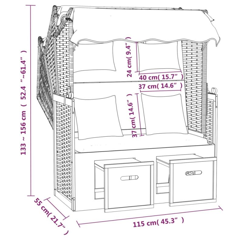 Това удобно плетено кресло Strandkorb осигурява голямо и приятно място за отдих на плажа, край реката или в градината. Първокласен материал: Патио шезлонгът с дървена рамка и плоска полиратанова тъкан е здрав, издръжлив и лесен за почистване с влажна кърпа.Практични характеристики: Плажният шезлонг е проектиран със сенник, който да ви предпазва от слънцето, а страничните му панели ви позволяват да му се насладите дори през ветровитите дни.Разтегателен дизайн: Разтегателната табуретка на шезлонга осигурява още по-високи нива на комфорт.Регулируема облегалка: Облегалката на този плажен стол може да се регулира в 3 позиции, така че винаги можете да намерите идеалната позиция за почивка.Удобно изживяване при сядане: Включените добре подплатени възглавници за глава и гръб осигуряват удобно изживяване при седене. Забележка:Забележка: За да удължите живота на вашите градински мебели, ви препоръчваме да ги защитите с водоустойчиво покритие.
