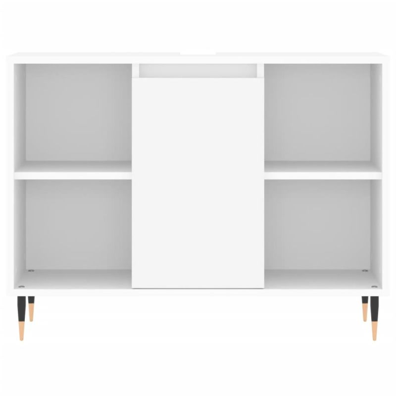 Този модерен комплект мебели за баня е предназначен да бъде отлично допълнение към вашата баня, придавайки ѝ подредена и впечатляваща визия! Издържлив материал: Инженерната дървесина е с изключително качество с гладка повърхност и също така се отличава със здравина, стабилност и устойчивост на влага. Железни крака: Железните крака добавят модерен и спокоен стил към вашия интериор, като същевременно гарантират стабилност.Достатъчно място за съхранение: Шкафът за баня предоставя различни възможности за съхранение и просторно пространство, за да държите предмети във вашата баня. Практичен дизайн: Горната част на шкафа за мивка за баня е идеална за поставяне на мивката. Внимание:За предотвратяване на преобръщане този продукт трябва да се използва с предоставения анкер за стена. Добре е да се знае:Мивката не е включена в доставката.Винтовете и дюбелите за вътрешната стена не са включени. Съветваме ви да намерите и използвате винтове и дюбели, подходящи специално за вашите стени. Ако не сте сигурни, можете да се консултирате с професионалист. Моля, прочетете и следвайте всяка стъпка от инструкциите.
