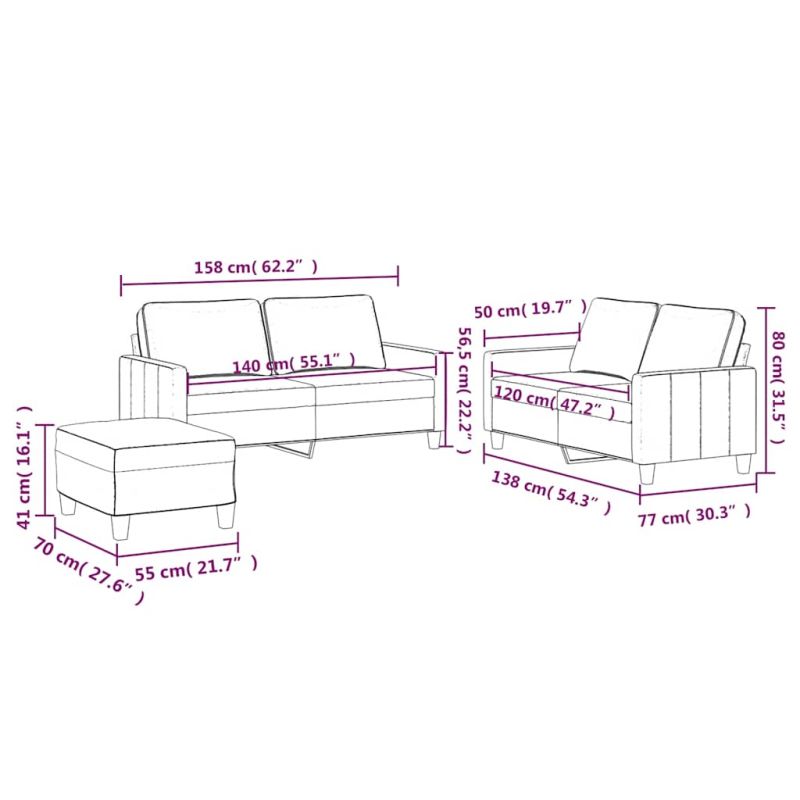 Този комплект дивани е отлично място за вашето време за разговори, четене, гледане на телевизия или просто почивка. Той е предназначен да бъде фокусна точка във вашия дом. Меко кадифе: Кадифето е мека и удобна материя, която се усеща приятно върху кожата.Здрава и стабилна рамка: Шперплатът и металната рамка на седалката на дивана осигуряват здравина и стабилност.Удобна седалка: Диванът е много удобен с дебело подплатената седалка и подлакътници.Функционална табуретка: Табуретката е подходяща за повдигане за крака, когато лежите на диван, или ви предлага допълнително място за сядане във вашата стая. Освен това семплият дизайн и компактният размер я правят идеална за сядане почти навсякъде в жилищното ви пространство. Максимално 110 кг на седалка. Съобразете се с риска от открит огън и други източници на силна топлина в близост до продукта.