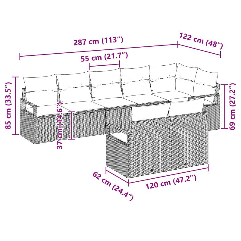 Този стилен комплект дивани променя представата за лукс и функционалност на вашата градина или тераса. С модерен и елегантен вид, той комбинира комфорт и красиви линии, за да създаде вашето открито убежище. Без значение дали посрещате гости, или се наслаждавате на времето за себе си, модулният дизайн позволява настройки, които отговарят на всяка нужда, правейки го универсален елемент за вашето открито пространство. Премиум материали: Комплектът градински дивани е изработен от качествен полиратан, който осигурява стил и дълговечност. UV-устойчивите свойства гарантират издръжливост, а прахово боядисаната стоманена рамка предлага здравина за години напред. Гъвкави компоненти: Модулният дизайн позволява персонализация, за да отговаря на всякакви нужди. Плоските подлакътници и пяната в възглавниците осигуряват комфорт, а всяка част е внимателно проектирана за удобство. Функционален дизайн: Лесният за настройка механизъм позволява бърза промяна на конфигурацията. Възглавниците с цип улесняват поддръжката, а матовото покритие добавя завършен вид. Отлично за открито ползване: Идеален за градини и тераси, комплектът подхожда на всяко открито пространство с модерен стил. Перфектен за събирания или спокойни моменти, той ще обогати вашето живеене на открито. Поддръжка и грижа: Запазете комплекта в отлично състояние, като го покриете, когато не го ползвате. Сменяемите калъфи на възглавниците улесняват почистването и поддържат свеж вид.