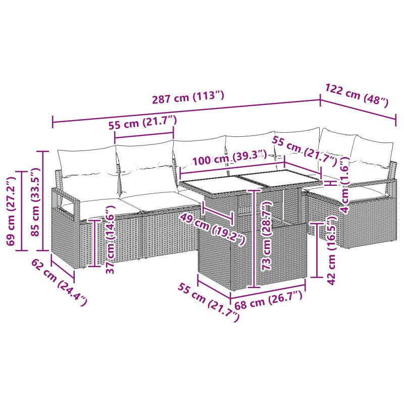 Този модулен градински диван е истинска находка за всяко открито пространство. Представете си как се отпуснете на елегантната му рамка с минималистичен дизайн и чисти линии. Просторните места за сядане са подходящи за всеки, който цени стил и удобство. Лесно може да се адаптира за всяка ситуация. Готови ли сте за незабравими срещи или уютни моменти с близките? Материал от полиратан С висококачествен полиратан, този диван е супер подходящ за открито. UV-устойчивите му свойства гарантират, че не избледнява, а водоотблъскващите функции го защитават от дъждове. Идеален е за градини, патии и тераси. Обширни компоненти Целият комплект включва различни седалки и маса, които предлагат комфорт и нужната функционалност. От ъгловите до централните седалки, всичко предоставя поддръжка, а масата – стабилна повърхност за хранене или декорация. Модерни функции Дизайнът му позволява гъвкави конфигурации. Може да го правите както искате – малък диван или разтегателна секция. Допълнен с квадратни подлакътници и прахово боядисана стомана, всяка функция е за максимално удоволствие. Разнообразни приложения Чудесен за пролет, лято и всякаква атмосфера. Идеален за утринно кафе на терасата или вечерни събирания с приятели. Практична поддръжка Лесна грижа – използвайте покривала, когато не го ползвате и при лошо време внасяйте възглавниците, за да запазите красотата му.