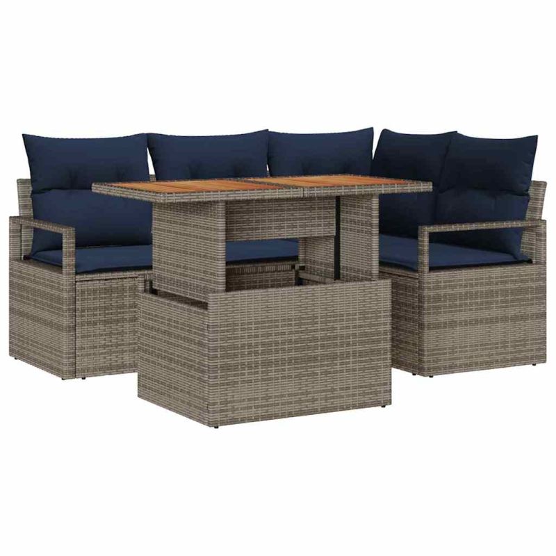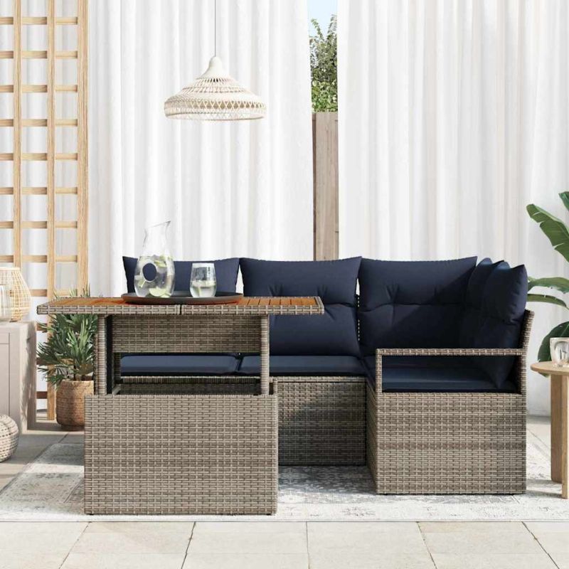 Този комплект за хранене от полиратан за градина съчетава модерен стил с универсалност, което го прави отлично предложение за открити събирания. Перфектно проектиран за градински и терасни обстановки, той разполага с елегантно покритие и ергономична структура, насочена към осигуряване на комфорт и стил. Плотът от масивна акациева дървесина е съчетан с полиратанови седалки, осигуряващи издръжлив, но изискан опит при храненията. Материал: Изработен от първокласен полиратан и масивна акациева дървесина, този комплект за хранене в градина балансира естетиката с устойчивостта. Полиратанът предлага UV устойчивост, което го прави подходящ за използване на открито през цялата година. Допълнително, прахово боядисаната стоманена рамка осигурява стабилна и сигурна основа, устойчива на метеорологичните условия, ефективно поддържайки модерен вид. Включени компоненти: Комплектът се състои от два кресла със функции за съхранение, ъглов стол, централен стол и градинска маса. Всеки елемент от седалката разполага с полиратанови облегалки и квадратни подлакътници, които увеличават ергономичния комфорт. Повърхностният материал е изработен от акациева дървесина, добавяйки нотка на естествена елегантност към вашата градина или тераса. Характеристики / Функция / Дизайн: Модулната способност позволява пренастройване, което се адаптира към различни пространствени изисквания и поводи. Регулируемите крака предлагат практическо персонализиране на височината, осигурявайки стабилност на неравни повърхности. Неговият ръчен механизъм за регулиране предлага гъвкавост без нужда от инструменти или електричество. Препоръчителни употреби: Идеален за градински партита, семейни вечери или неформални кафе паузи, този комплект за открито е прекрасно допълнение за подобряване на моментите на отдих в патийна среда. Той съвпада с различни декорации с модерен минималистичен дизайн, предлагайки функционалност и стил за летни и пролетни обстановки. Грижа и поддръжка: Защитете комплекта с водоустойчиво покривало, когато не се използва, за да поддържате перфектния му вид. Подвижните седалкови възглавници позволяват лесно почистване, а използването на покривалото гарантира, че мебелите остават защитени от сурови метеорологични условия, удължавайки тяхната издръжливост.