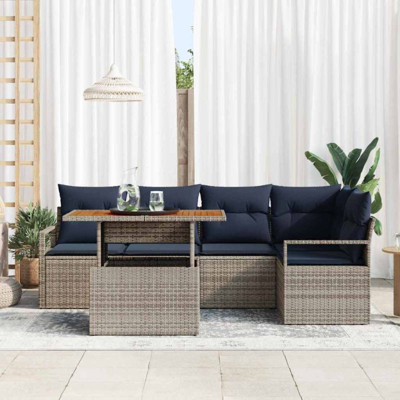 Този изискан комплект за хранене от поли ратан безпроблемно съчетава стилен дизайн и функционална универсалност, идеален за подобряване на откритите жизнени пространства. Правоъгълната конфигурация излъчва модерна простота с чисти линии и минималистична привлекателност, която effortlessly допълва всяка градина или тераса. Като ненатрапчив център на събирания, този комплект за хранене се адаптира към различни социални сценарии, ефективно обслужвайки интимни семейни вечери или по-големи открити партита. Будейки издръжливи и устойчиви на времето, той осигурява дълготрайно удоволствие през пролетта и лятото. Висококачествени материали: Изработен от премиум поли ратан, известен със своето UV устойчвост, осигурява дълготрайност на комплекта срещу слънце и време, докато предлага изискан, естествен външен вид с текстурата на повърхността си. Прахово боядисаната стомана добавя здравина и стабилност на рамката, което е от съществено значение за устойчивост на външни условия. Интегрирани решения за съхранение: Изобретателно проектираните ръкохватки и централните места включват вградени отделения за съхранение, позволявайки ти да организираш и съхраняваш възглавници или градински основи ефективно. Тази функция е особено полезна за поддържане на пространство на открито без бъркотия, осигурявайки, че всичко, от което се нуждаеш, е винаги под ръка. Функционални дизайнерски елементи: Комплектът разполага с модулни възможности, позволяващи множество конфигурации, за да отговарят на различни събирания или пространствени нужди. Регулируемите крака подобряват стабилността на неравни повърхности, поддържайки комфорт и удобство с минимални усилия. Дизайнът включва както привлекателен плот от акациева дървесина, така и ергономични елементи като подлакътници, удобни за релаксирано социализиране. Препоръчано за външна употреба: Идеално подходящ за тераси, палуби и градини, този комплект за хранене преобразява твоята външна площ в приветливо и стилно убежище за хранене, развлечения или просто релаксация с семейство и приятели. Естетическата елегантност и практичният дизайн го правят универсален за различни оформления и употреби. Лесна поддръжка: Последователната грижа включва използването на водонепроницаемо покритие за защита на този комплект, когато не се използва, осигурявайки дълголетие. Устойчивостта на материалите прави почистването лесно; просто избърши с влажна кърпа, за да изглежда безупречно. Подходящата поддръжка разширява визуалната му привлекателност и операционната надеждност.
