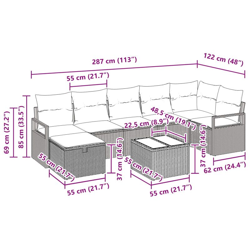 Този комплект градински дивани е стилно и практично решение за сядане на открито, подходящо за тераси или градини. Със съвременния си вид, той съчетава елегантност и функционалност, предоставяйки чист, минималистичен стил, който се вписва в различни външни оформления. Комплектът предлага достатъчно места за теб, семейството ти и приятелите, създавайки приятна обстановка за неформални срещи или специални поводи. Устойчиво строителство Диванът е направен с издръжливи материали от висококачествен полиратан. Той гарантира, че частите ще издържат на времето и ще запазят вида си дори при слънце и дъжд. Практични компоненти Гърбът от полиратан и подлакътниците, заедно с подвижните възглавници, добавят комфорт, което прави дългите часове в градината наистина приятни. Функционален и реорганизируем Модулният дизайн ти позволява да пренаредиш частите на дивана по желание, за да отговорят на твоите нужди и плана на градината. Налично място за съхранение Комплектът предлага скрити отделения, които осигуряват пространство за градински вещи или възглавници, които да не се виждат, но да са лесно достъпни. Съвети за поддръжка Запази мебелите в добро състояние, като ги покриваш, когато не се използват, за да ги защитиш от лошо време и да удължиш живота им в градината или на терасата.