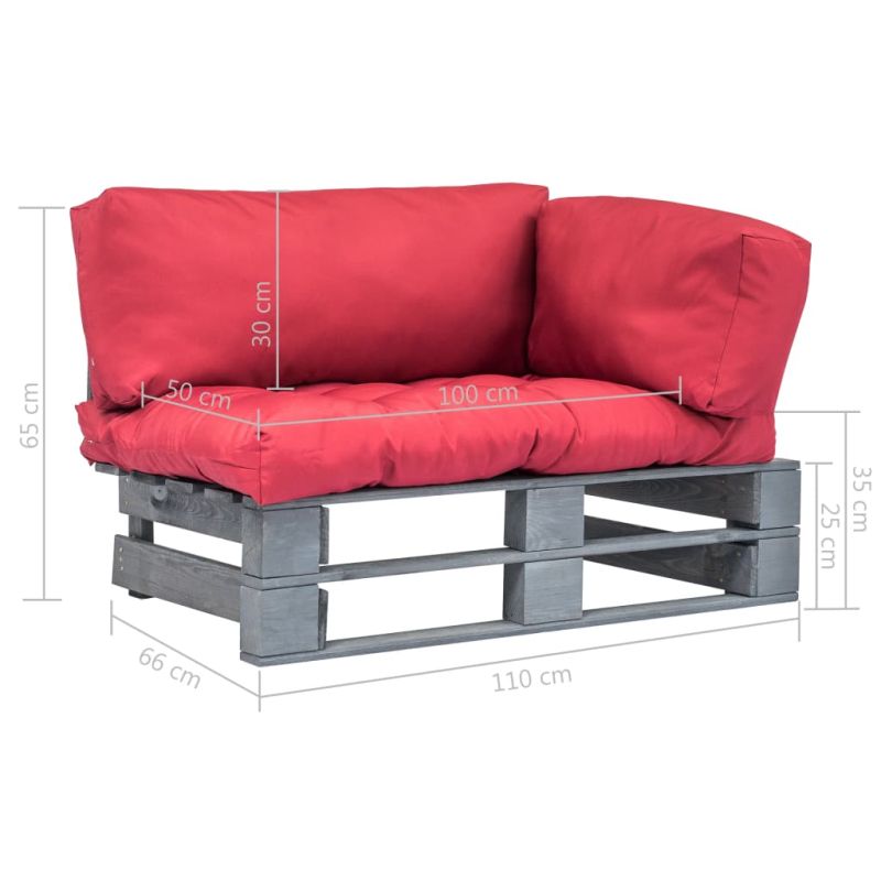 Градински палетен диван с червени възглавници, борово дърво