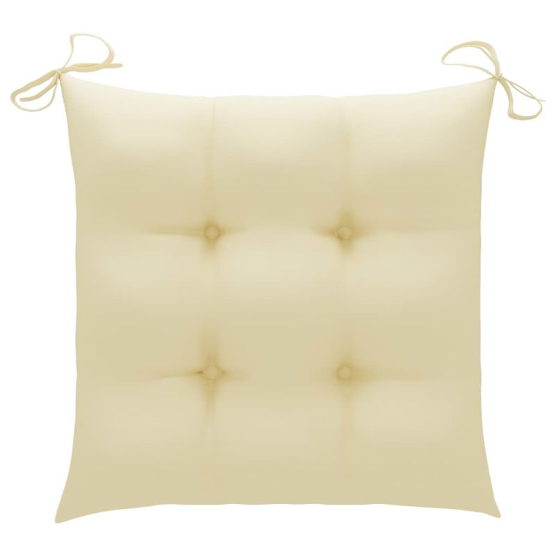 Тези сгъваеми столове от акациево дърво масив с възглавници осигуряват идеалното място за отдих и наслада на слънцето в градината или вътрешния двор. Тези градински столове са изработени от масивна акациева дървесина, което ги прави здрави и стабилни. Масивното акациево дърво има силата да понесе тежестта и да издържи на износването на времето, така че тези външни столове осигуряват години на релакс. Освен това столовете могат да се сгъват, за да се пести място, когато не се използват. Включените възглавници придават допълнителен комфорт. Всяка възглавница разполага с два комплекта връзки, за да се фиксира плътно върху стола. Максимално 110 кг на седалка.