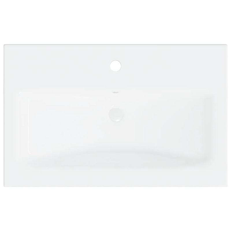 Този шкаф за баня с вградена мивка е идеалното допълнение към вашата баня или тоалетна с впечатляващия си изчистен вид. Шкафът е изработен от ПДЧ, което го прави здрав и стабилен. Шкафът за съхранение е снабден с 1 отделение и 2 врати, предлагайки достатъчно място за съхранение на предмети. Той пасва идеално под вашата мивка и прави съхранението в банята доста удобно. Изработен от керамика, умивалникът може да служи не само като съд за ежедневна употреба, но и като украшение във вашето жилищно пространство. Благодарение на своя модерен дизайн този умивалник определено ще подхожда на всеки интериор. Оборудван е и с преливник, който позволява изтичане на водата, когато се препълни. Гланцираната му повърхност придава модерен и същевременно елегантен дизайн. Освен това шкафът и мивката се почистват лесно с влажна кърпа. Моля, обърнете внимание: Доставката включва кран и преливник. Децата трябва да бъдат наблюдавани, за да се гарантира, че не си играят с уреда. Дръжте децата далеч от зоната на монтажа. Внимание: Прочетете внимателно инструкциите, преди употреба, и ги запазете за бъдещи справки.