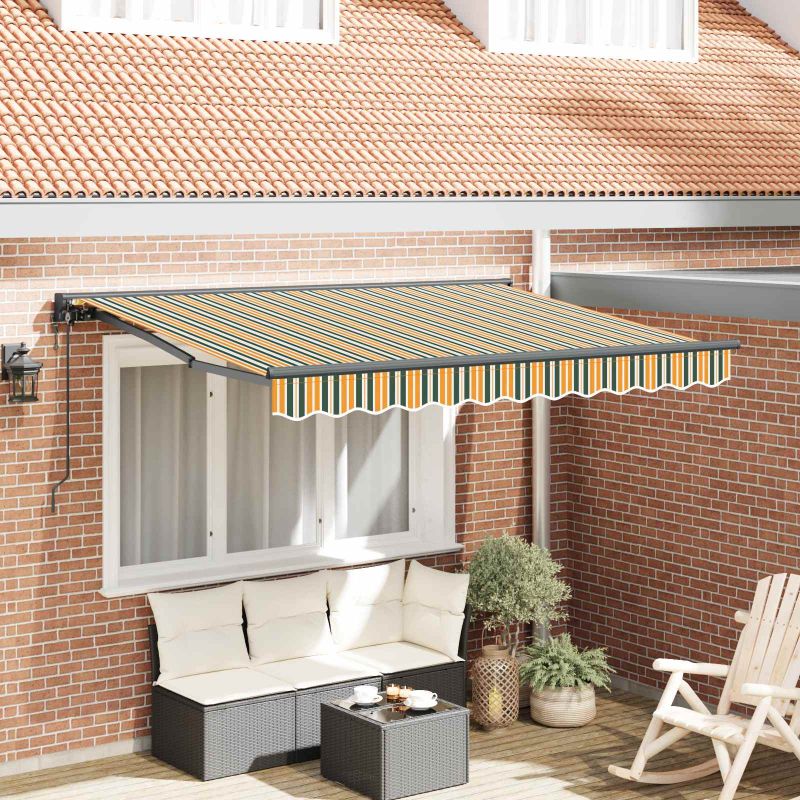 Този модерен сгъваем сенник е направен за открити пространства, предлагащ стил и практичност. Има елегантен и гладък дизайн с райета, който придава живописен вид, докато осигурява сянка от силното слънце през лятото. Европейски вдъхновен стил Стилен и модерен дизайн с чисти линии, който идеално се вписва в терасата или двора. Прибираемият му механизъм го прави перфектен за тези, които искат удобство и стил. Здрави материали Издръжлива тъкан, устойчива на UV лъчи и вода. Алуминиевата рамка е здрава и лека, правейки монтажа лесен. Гъвкава функционалност Може да се разтяга напълно или да се прибира, за да спестява пространство. Тази функция е супер удобна, когато искате да контролирате количеството слънчева светлина. Лесна поддръжка Само бързо избърсване с мокра кърпа е нужно, за да остане в отлично състояние. Проектиран е да устои на времето, осигурявайки дълготрайност с минимални усилия. Адаптивен в различни настройки Подходящ е за градини, тераси или около басейн. Осигурява сянка, идеална за летни партита или релаксиращи кътчета навън. Опасност! Силен отскок при отваряне. НЕ сваляйте това въже, освен ако не сте приключили с всички стъпки на сглобяване. Всички болтове трябва да са затегнати и елементът да е прикрепен към стената! Предупреждение! Внимавайте, когато разхлабвате рамената, защото те са под напрежение! Внезапното освобождаване на рамо на сгъваема тента може да причини нараняване. Внимание: Инструкциите за ползване трябва да бъдат прочетени преди употребата на продукта. Предупреждение: Работата в студени условия може да повреди продукта. Външна употреба в сгради и други строителни обекти. Не позволявайте на деца да си играят с управляващото устройство на щората. Дръжте дистанционното управление далеч от деца.