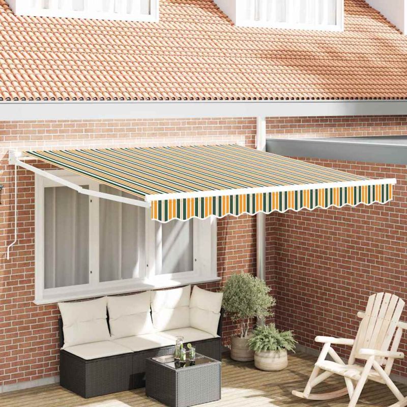 Този прибираем сенник е перфектно допълнение за вашата тераса или градина, с привлекателен вид благодарение на ярката зелена и жълта полиестерна материя. Идеален за летните дни, той съчетава съвременен стил с проста функционалност, лесна за съвпадение с всяко открито място. Независимо дали искате да похапвате на открито, да работите или просто да релаксирате, този сенник предлага спокойна и защитена зона, обогатявайки вашето изживяване навън. Материали: Изработен от здрав полиестер, известен със своята дълговечност, този сенник е създаден да издържа на различни условия. UV-устойчивостта му осигурява дълготрайност и не позволява избеляване дори при постоянно слънце, като допринася за комфортно открито пространство. Включени компоненти: Сенникът идва с горна част 300 x 250 см и здрава рамка 300 x 250 x 165 см, осигуряваща стабилност и покритие. Класическите зелени и жълти цветове добавят нотка цвят. Ръчният механизъм за прибиране позволява лесно регулиране на сянката, осигурявайки оптимален комфорт. Функции / Функция / Дизайн: Проектиран с акцент на лесното използване, този сенник предлага различна сянка за различни нужди. UV-устойчивите му материали предпазват мебелите и кожата от вредните лъчи, което осигурява безопасност и стил. Простата ръчна система позволява лесно коригиране на сянката без нужда от механични средства. Препоръчителни употреби: Отличен за градини и тераси, този сенник е идеален за семейства или угощения, които искат да се насладят на откритото. Той е гъвкав и подходящ за всякакви дейности – от обяд на открито до уютна чаша кафе в следобеда. Грижа и поддръжка: Поддържайте го в отлично състояние с бързо почистване или лек сапун и вода. Проверявайте редовно за износване на рамката или материята и прибирайте при лошо време, за да осигурите продължителна употреба. Опасност! Силен отскок при отваряне. НЕ сваляйте това въже, освен ако не сте приключили с всички стъпки на сглобяване. Всички болтове трябва да са затегнати и елементът да е прикрепен към стената! Предупреждение! Внимавайте, когато разхлабвате рамената, защото те са под напрежение! Внезапното освобождаване на рамо на сгъваема тента може да причини нараняване. Внимание: Инструкциите за ползване трябва да бъдат прочетени преди употребата на продукта. Предупреждение: Работата в студени условия може да повреди продукта. Външна употреба в сгради и други строителни обекти.