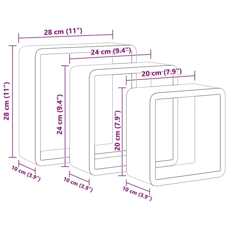 Този комплект от 3 стенни кубични рафта е предназначен да бъде централната точка на всяка стая. Тези кубични органайзери са изработени от МДФ, който е стабилен и издръжлив. С невидима система за монтаж, тези ъглови рафтове са лесни за инсталиране и служат като идеалното място за поставяне на предмети като награди, книги, колекционерски предмети, орнаменти и др. Ъгловите рафтове са подходящи за повечето декори и лесно превръщат празната стена в дизайнерски елемент!