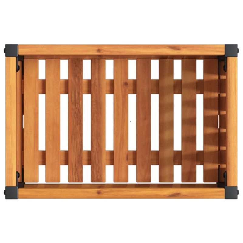 Тази градинска кашпа е идеален избор за отглеждане на различни цветя или растения. Стабилна и дълготрайна рамка: Масивното акациево дърво е известно със своята здравина и издръжливост. Неговите разнообразни цветове и уникални зърнести шарки му придават привлекателен вид. С добра стабилност и устойчивост на атмосферни влияния, тя е идеална за изработка на вътрешни и външни мебели.Стабилна рамка: Прахово боядисаната стоманена рамка е здрава, стабилна, издръжлива и устойчива на корозия и неблагоприятни атмосферни условия, което гарантира дълготрайна експлоатация.Достатъчно пространство за засаждане: Кутията за цветя може да побере любимите ви растения или цветя, което е идеално за вашия интериор като декорация.Декоративна функция: Плантерната кутия може да побере любимите ви растения или цветя, което е идеално за декориране на вашия интериор.Добра вентилация: Дизайнът с ламели осигурява циркулация на въздуха и предотвратява знойната топлина.