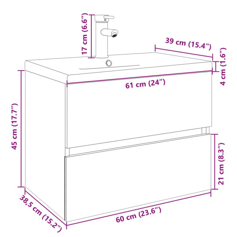 Този практичен комплект мебели за баня, разполагащ с просторно пространство за съхранение, е отлично допълнение към вашата баня, като ѝ придава подреден и впечатляващ вид! Издръжлив материал: Инженерната дървесина е с изключително качество с гладка повърхност и също така се отличава със здравина, стабилност и устойчивост на влага.Издръжлив материал: Мивката за баня, изработена от керамика, има устойчива повърхност, която издържа на удари, петна и драскотини, което гарантира дълготраен блясък.Достатъчно място за съхранение: Шкафът за баня предоставя достатъчно място за съхранение, където да държите различни ваши вещи добре организирани и леснодостъпни.Спестяващ пространство дизайн: Мебелите за баня могат да бъдат монтирани на стена, за да добавят допълнително място за съхранение. По този начин можете да увеличите максимално пространството на пода и да поддържате чистота. Добре е да се знае:Винтовете и дюбелите за вътрешната стена не са включени. Съветваме ви да намерите и използвате винтове и дюбели, подходящи специално за вашите стени. Ако не сте сигурни, можете да се консултирате с професионалист. Моля, прочетете и следвайте всяка стъпка от инструкциите.