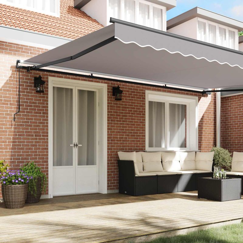 Този модерен прибираем сенник добавя стил и функция на всяка градина или тераса. С дизайна си, който комбинира простота и модерна естетика, той е страхотно допълнение към откритото пространство. Предназначен за външна употреба, той предлага много сянка, което увеличава комфорта особено през лятото. Подходящ за гъвкаво използване, този сенник е за онези, които обичат комбинацията от комфорт и стил в градината или на терасата. Модерен дизайн: Съчетава изтънченост с функционалност, нашият прибираем сенник носи модерен стил и простота, която му позволява да се впише в различни архитектурни стилове, безшевно интегрирайки се с околната среда. Здрави материали: Направен от качествен полиестер и здрава стомана, този сенник предлага добра устойчивост на времето и осигурява UV, водо- и избледняваща защита за продължителна употреба. Ръчно регулиране: Лесният механизъм за ръчно регулиране на сенника позволява на потребителите лесно да разширяват или свиват сянката, нагласявайки покритието според предпочитанията си. Решение за слънце: Идеален за лятно време, този сенник прави откритите занимания по-приятни, предлагайки надеждна защита от слънцето. Лесна поддръжка: Проектиран с идеята за простота, поддръжката включва основно почистване с мек сапун и вода, а здравите материали изискват минимални грижи, за да остане визуално привлекателен. Опасност! Силен отскок при отваряне. НЕ сваляйте това въже, освен ако не сте приключили с всички стъпки на сглобяване. Всички болтове трябва да са затегнати и елементът да е прикрепен към стената! Предупреждение! Внимавайте, когато разхлабвате рамената, защото те са под напрежение! Внезапното освобождаване на рамо на сгъваема тента може да причини нараняване. Внимание: Инструкциите за ползване трябва да бъдат прочетени преди употребата на продукта. Предупреждение: Работата в студени условия може да повреди продукта. Външна употреба в сгради и други строителни обекти.