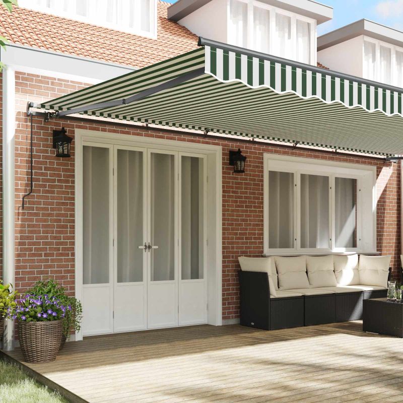 Този модерен прибираем сенник добавя стил и функция на всяка градина или тераса. С дизайна си, който комбинира простота и модерна естетика, той е страхотно допълнение към откритото пространство. Предназначен за външна употреба, той предлага много сянка, което увеличава комфорта особено през лятото. Подходящ за гъвкаво използване, този сенник е за онези, които обичат комбинацията от комфорт и стил в градината или на терасата. Модерен дизайн: Съчетава изтънченост с функционалност, нашият прибираем сенник носи модерен стил и простота, която му позволява да се впише в различни архитектурни стилове, безшевно интегрирайки се с околната среда. Здрави материали: Направен от качествен полиестер и здрава стомана, този сенник предлага добра устойчивост на времето и осигурява UV, водо- и избледняваща защита за продължителна употреба. Ръчно регулиране: Лесният механизъм за ръчно регулиране на сенника позволява на потребителите лесно да разширяват или свиват сянката, нагласявайки покритието според предпочитанията си. Решение за слънце: Идеален за лятно време, този сенник прави откритите занимания по-приятни, предлагайки надеждна защита от слънцето. Лесна поддръжка: Проектиран с идеята за простота, поддръжката включва основно почистване с мек сапун и вода, а здравите материали изискват минимални грижи, за да остане визуално привлекателен. Инструкциите за експлоатация трябва да се прочетат преди монтирането и използването на продукта. Съхранявайте това ръководство за бъдещи справки. Този продукт е предназначен за използване на открито и в домашни условия само като слънцезащита или декорация. Никога не го използвайте за други цели и не модифицирайте продукта. Не го използвайте на места, където има вибрации, импулси или високи температури, като например стени в близост до печки. Винаги носете подходящи лични предпазни средства, когато монтирате и регулирате тентата. При работа на голяма височина съществува риск от падане, използвайте подходяща защита срещу падане. Бъдете внимателни по време на монтажа, възможно е да съществуват рискове от смачкване и срязване. НЕ премахвайте предпазните обвивки. Тези обвивки могат да бъдат отстранени само след като са завършени всички етапи на монтажа и всички болтове са закрепени, а изделието е прикрепено към стената. Прекалено ранното отстраняване на обвивките може да доведе до сериозни наранявания. Този продукт и неговите крепежни части са подходящи за монтаж само върху обикновена циментова стена или стабилна неизмазана тухлена зидария. Ако стената/тухлената зидария показва пукнатини, трябва да се консултирате с професионалист. Ако сградата ви има външна обвивка (като изолация, двойна тухлена стена или облицовка от тухли), монтажът трябва да се изнесе от професионалист. Никога не го монтирайте на високи и ветровити места, тъй като сенникът може да падне и да нарани хора. Не монтирайте тентата, когато са открити повредени или липсващи части. Външната щора трябва да се прибере, ако скоростта на вятъра е по-висока от 28 км/ч. Преди да отворите тентата, уверете се, че всички конзоли са монтирани здраво в стойките на стената и всички болтове са добре затегнати ВСИЧКИ ЗАТВАРЯТ тентата по време на силен или бурен вятър, дъжд и когато не се използва. Ако не го направите, това може да доведе до телесни нараня
