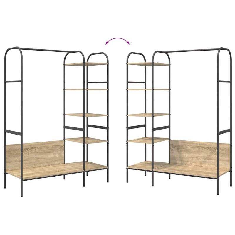 Тази модерна стойка за дрехи предлага изчистени линии и простота, което я прави перфектна за всяка всекидневна. С праволинеен дизайн и минималистичен стил е чудесна за тези, които искат да съчетаят естетика и функционалност. Изработена от инженерна дървесина и стомана, предлага добро решение за запазване на реда в гардероба. Състав на материала: Изработена от инженерна дървесина, стойката осигурява както здравина, така и стил. Материалите са издръжливи и леки, което улеснява преместването ѝ. Съвременна естетика: Правоъгълният дизайн отговаря на съвременните стилове на декор, а черната рамка добавя модерен щрих в помещението. Интегрирано съхранение: С просторни рафтове, тази стойка предлага чудесно място за съхранение на дрехи, обувки и аксесоари. Изисквания към монтажа: Лесен монтаж, само с отвертка и двама души, позволява бърза употреба. Грижа и безопасност: Инструкции за закрепване към стената предотвратяват преобръщане. Лесно се поддържа, просто я избърсвайте редовно.