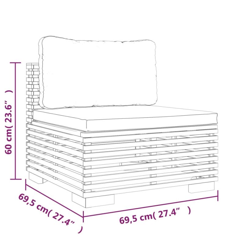 Този дървен среден диван, отличаващ се с решетъчен дизайн и меки възглавници, ще бъде чудесно допълнение към вашата градина, тераса или вътрешен двор за разговори със семейството и приятелите или просто да се любувате на времето. Масивна тикова дървесина: Масивната тикова дървесина е красив естествен материал. Тя е обветрена, изсушена в пещ и след това фино шлифована, за да ѝ се придаде много гладък вид. Тиковото дърво е известно със своята изключителна здравина и устойчивост на атмосферни влияния.Мека възглавница: Дебело подплатените възглавници за седалка и облегалка на този външен диван добавят максимален комфорт.Практичен дизайн: Модулът се мести лесно, което ви улеснява да създавате различни оформления, които отговарят на вашите нужди. Можете да намерите други модули мека мебел със същия дизайн и стил в нашия магазин, за да подредите свои собствени аранжировки за отдих. Забележка:Всеки продукт се доставя с ръководство за сглобяване в кашона за лесно сглобяване.Забележка: За да удължите живота на вашите градински мебели, ви препоръчваме да ги защитите с водоустойчиво покривало. Максимално 110 кг на седалка. Съобразете се с риска от открит огън и други източници на силна топлина в близост до продукта.