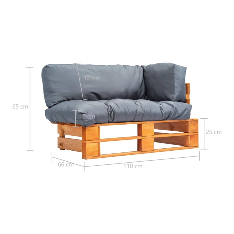 Градински палетен диван със сиви възглавници, борово дърво
