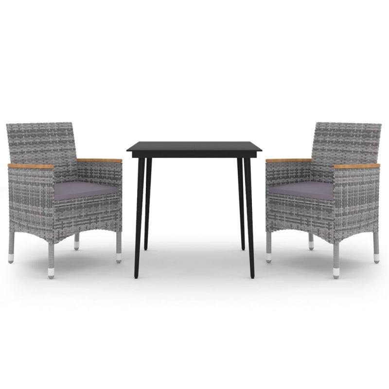 Този стилен градински трапезен комплект ви осигурява спокойно и комфортно време със семейството и приятелите. Прахово боядисаната стоманена рамка прави масата и столовете здрави и издръжливи. Изработени от устойчив на атмосферни влияния и водоустойчив PE ратан, столовете са лесни за почистване, издръжливи и подходящи за ежедневна употреба. Гладкият стъклен плот е идеален за поставяне на напитки, храна или някои декоративни предмети. Освен това дебело подплатената възглавница на седалката добавя допълнителен комфорт при седене на столовете. Забележка: За да удължите живота на вашите градински мебели, ви препоръчваме да ги защитите с водоустойчиво покритие. Максимално 110 кг на седалка. Съобразете се с риска от открит огън и други източници на силна топлина в близост до продукта.