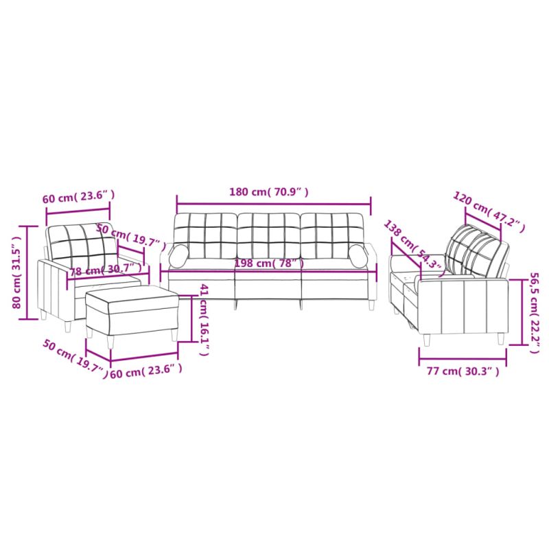 Този комплект дивани е отлично място за вашето време за разговори, четене, гледане на телевизия или просто почивка. Той е предназначен да бъде фокусна точка във вашия дом. Издръжлив текстил: Материята се отличава със семпъл и изчистен вид, като същевременно остава дишаща и дълготрайна.Здрава и стабилна рамка: Шперплатът и металната рамка на седалката на дивана осигуряват здравина и стабилност.Удобна седалка: Диванът е много удобен с дебело подплатената седалка, подлакътниците и възглавницата за гърба.Практични ролкови възглавници: Тези цилиндрични възглавници не само освежават интериора, но и добавят допълнителен комфорт, докато седите или лежите.Функционална табуретка: Табуретката е подходяща за повдигане за крака, когато лежите на диван, или ви предлага допълнително място за сядане във вашата стая. Освен това семплият дизайн и компактният размер я правят идеална за сядане почти навсякъде в жилищното ви пространство. Максимално 110 кг на седалка. Съобразете се с риска от открит огън и други източници на силна топлина в близост до продукта.