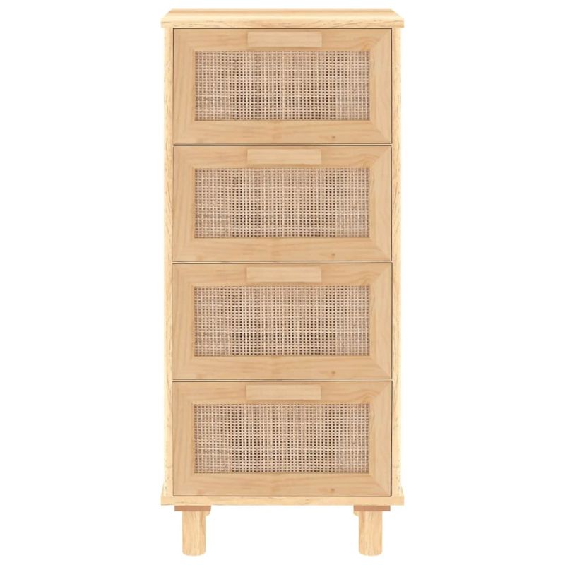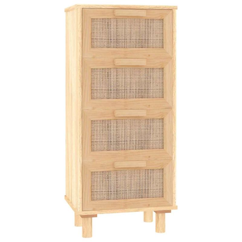 Този практичен бюфет е предназначен да посрещне различните ви нужди и е идеално допълнение към вашата стая. Издържлив материал: Инженерната дървесина е с изключително качество с гладка повърхност и също така се отличава със здравина, стабилност и устойчивост на влага.Достатъчно място за съхранение: Снабден с 4 чекмеджета, шкафът предоставя достатъчно място за съхранение, където да държите различните си вещи добре организирани и леснодостъпни. Освен това дизайнът с тъкан естествен ратан на чекмеджето добавя допълнителна красота.Крака от масивна борова дървесина: Дървените крака придават на бюфета естествен и приятен вид, като същевременно осигуряват стабилност. Може да се съчетае добре с всеки интериорен декор.Здрав плот: Върху този шкаф можете да поставяте любимите си снимки, декорации или цветя, за да разнообразите живота си. Забележка:Всеки продукт се доставя с ръководство за сглобяване в кашона за лесно сглобяване. Внимание:За да се предотврати преобръщане, този продукт трябва да се използва с предоставената приставка за стена.