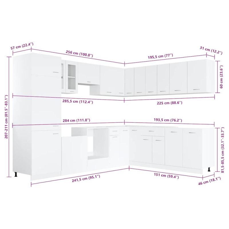 Комплект кухненски шкафове, 14 части, "Lyon", бяло инженерно дърво
