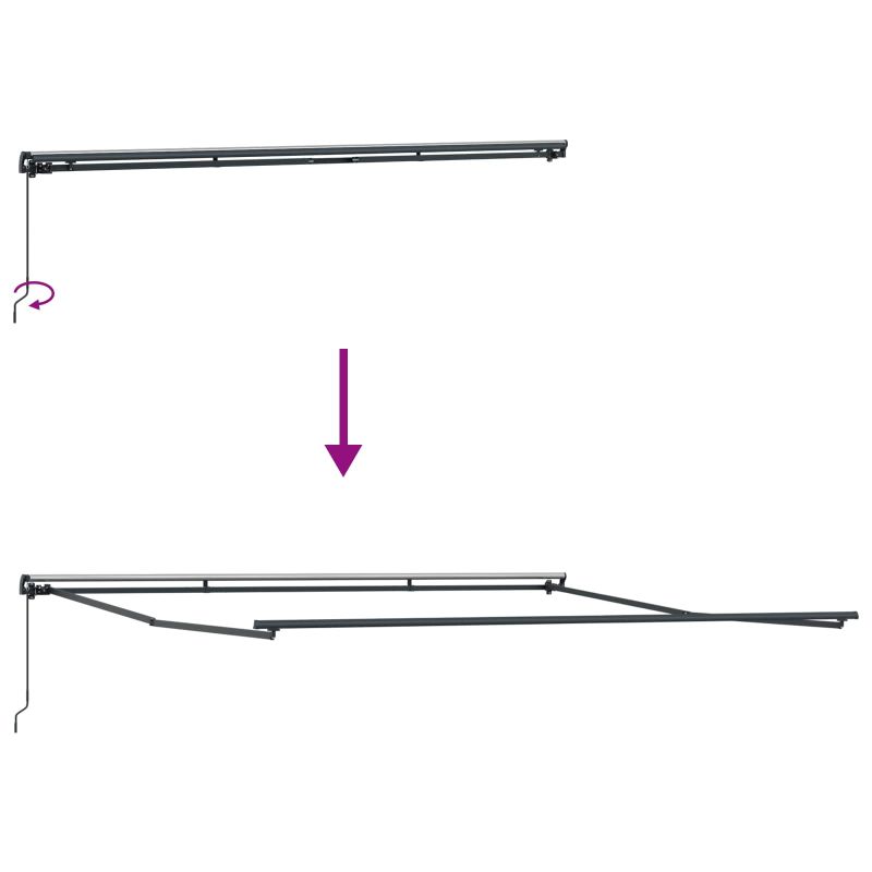 Този модерен прибираем сенник добавя стил и функция на всяка градина или тераса. С дизайна си, който комбинира простота и модерна естетика, той е страхотно допълнение към откритото пространство. Предназначен за външна употреба, той предлага много сянка, което увеличава комфорта особено през лятото. Подходящ за гъвкаво използване, този сенник е за онези, които обичат комбинацията от комфорт и стил в градината или на терасата. Модерен дизайн: Съчетава изтънченост с функционалност, нашият прибираем сенник носи модерен стил и простота, която му позволява да се впише в различни архитектурни стилове, безшевно интегрирайки се с околната среда. Здрави материали: Направен от качествен полиестер и здрава стомана, този сенник предлага добра устойчивост на времето и осигурява UV, водо- и избледняваща защита за продължителна употреба. Ръчно регулиране: Лесният механизъм за ръчно регулиране на сенника позволява на потребителите лесно да разширяват или свиват сянката, нагласявайки покритието според предпочитанията си. Решение за слънце: Идеален за лятно време, този сенник прави откритите занимания по-приятни, предлагайки надеждна защита от слънцето. Лесна поддръжка: Проектиран с идеята за простота, поддръжката включва основно почистване с мек сапун и вода, а здравите материали изискват минимални грижи, за да остане визуално привлекателен. Опасност! Силен отскок при отваряне. НЕ сваляйте това въже, освен ако не сте приключили с всички стъпки на сглобяване. Всички болтове трябва да са затегнати и елементът да е прикрепен към стената! Предупреждение! Внимавайте, когато разхлабвате рамената, защото те са под напрежение! Внезапното освобождаване на рамо на сгъваема тента може да причини нараняване. Внимание: Инструкциите за ползване трябва да бъдат прочетени преди употребата на продукта. Предупреждение: Работата в студени условия може да повреди продукта. Външна употреба в сгради и други строителни обекти.