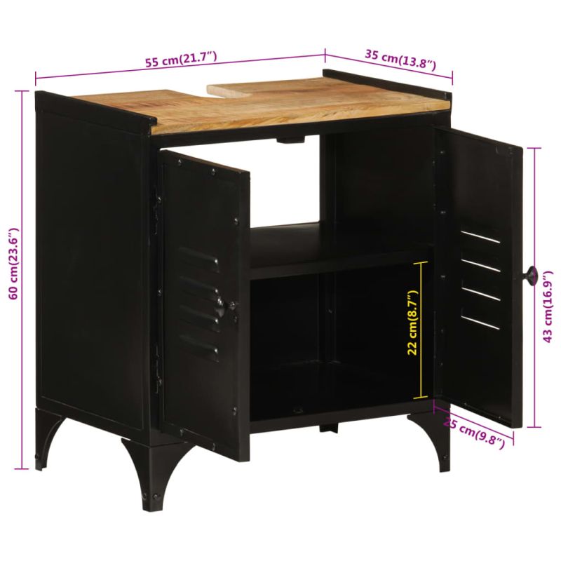 Този шкаф за мивка е отлично допълнение към вашата баня, придавайки ѝ подреден и впечатляващ вид! Издръжлив материал: Желязото е здрав и твърд материал. То е солиден фаворит в промишленото и мебелното строителство. Масивна мангова дървесина: Масивната дървесина от манго е здрава тропическа дървесина, от която се произвеждат здрави мебели. Красивите ѝ дървесни шарки правят всяка мебел малко по-различна от следващите.Достатъчно място за съхранение: Шкафът за мивка за баня разполага с 2 врати, с което предлага достатъчно място за лесно поставяне на вашите основни тоалетни принадлежности и артикули за баня, като сапуни, шампоан, паста за зъби и др. Спестяващ място дизайн: Горната част на шкафа за баня е идеална за поставяне на мивката, така че да можете да използвате напълно свободното пространство под мивката. Внимание:За да предотвратите преобръщането му, този продукт трябва да се използва с устройството за закрепване на стена (не е предоставено). Добре е да се знае:Всеки артикул е уникален с вариации в цветове и зърна. Доставката е на случаен принцип, което гарантира ексклузивността и индивидуалността на вашия продукт.