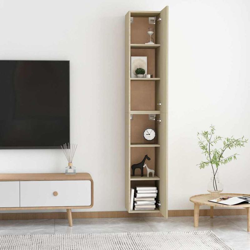 Този комплект окачени ТВ шкафове е предназначен да бъде фокусна точка на вашата всекидневна с модерния си и практичен дизайн. Тези ТВ шкафове за стенен монтаж са изработени от инженерна дървесина, който ги прави здрави и стабилни. Всеки шкаф разполага с 2 рафта, което го прави идеално място за съхранение на всички ваши книги, списания, DVD-та или други предмети. Шкафовете за стена се почистват лесно с влажна кърпа.