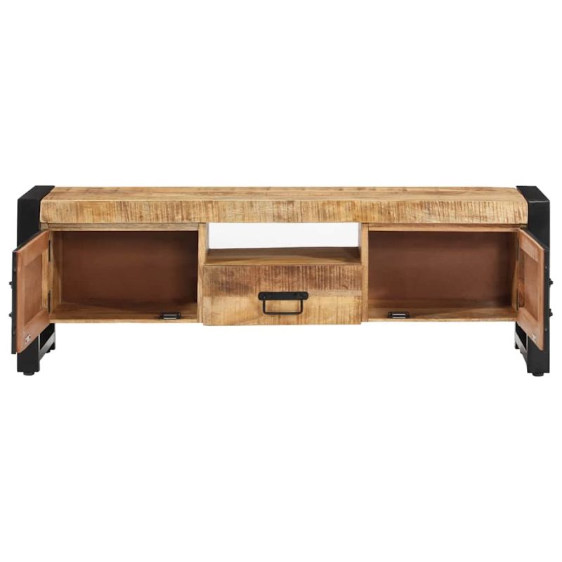 Този класически дървен ТВ шкаф с уникален дизайн моментално добавя нотка индустриален стил към жилищното ви пространство. Мангово дърво масив: Тази ТВ поставка е изработена от масивно мангово дърво – твърда дървесина с плътни шарки. Масивното мангово дърво не само има силата да понесе тежестта, но и издържа на износване във времето.Прахово боядисано желязо: Желязото с черно прахово покритие на ТВ модула осигурява допълнителна стабилност.Просторно място за съхранение: Шкафът за мултимедийни устройства разполага с три отделения и едно чекмедже, които осигуряват достатъчно място за съхранение, за да държите необходимите ви вещи подредени и на една ръка разстояние.Практични вратички: Поддържайте реда в помещението, като скриете дребните вещи зад вратичките на този модул за мултимедийни устройства. Забележка:Цветовете могат да варират, което прави всеки артикул уникален и малко по-различен от следващия. Доставката е на случаен принцип.Всеки продукт се доставя с ръководство за сглобяване в кашона за лесно сглобяване.
