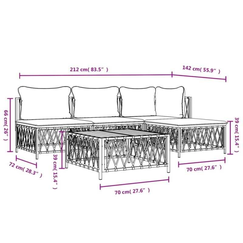 Насладете се на чаша кафе или чай на открито с този удобен градински лаундж комплект! Издръжлив материал: Тъканият плат е всеки текстил, образуван чрез тъкане. Това е изключително полезен вид плат, който използваме много в ежедневието си поради неговата издръжливост и гъвкавост.Здрава рамка: Прахово боядисаната стоманена рамка прави лаундж комплекта здрав и стабилен за ежедневна употреба на открито.Удобно седене: Облегалката добавя повече комфорт при седене на дивана за открито. Освен това дебело подплатените възглавници осигуряват комфорт по време на седене.Модулен дизайн: Комплектът диван е гъвкав и лесен за преместване, така че можете да го комбинирате с други модулни сегменти в уеб магазина, за да създадете свои лични конфигурации на градински лаундж комплект! Забележка:За да сте сигурни, че вашите външни мебели ще останат красиви, ви препоръчваме да ги защитите с водоустойчиво покривало. Максимално 110 кг на седалка. Съобразете се с риска от открит огън и други източници на силна топлина в близост до продукта.