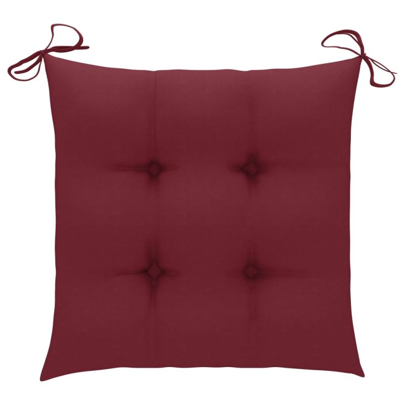Този модерен комплект дървени трапезни столове с възглавници ще добави докосване на естествен стил в градината, терасата или вътрешния двор. Този комплект дървени столове ще бъде чудесен избор за вечеря на открито. Тези градински столове са изработени от масивно акациево дърво – тропическа твърда дървесина, устойчива на атмосферни влияния и издръжлива на дългогодишна употреба. Покритата с маслен финиш повърхност се почиства лесно с влажна кърпа. Дизайнът с ламели внася рустик чар. Нещо повече, включените възглавници осигуряват допълнителен комфорт по време на седене. Изработени са от 100% полиестер, който е обработен, за да бъде водоустойчив. Всяка възглавница има два комплекта ленти, които да я фиксират плътно върху стола. Максимално 110 кг на седалка.