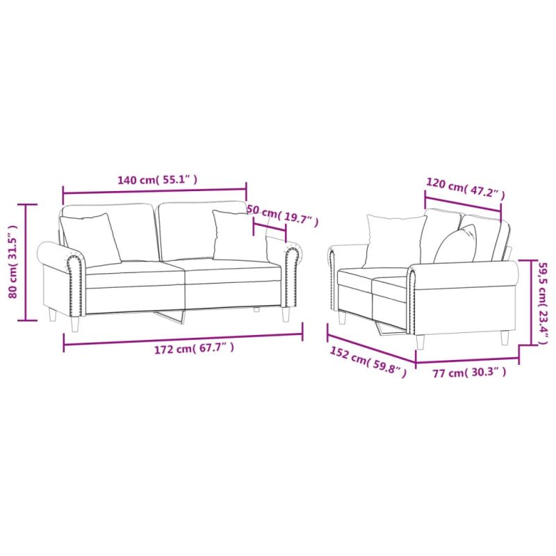 Този комплект дивани е отлично място за вашето време за разговори, четене, гледане на телевизия или просто почивка. Той е предназначен да бъде фокусна точка във вашия дом. Меко кадифе: Кадифето е мека и удобна материя, която се усеща приятно върху кожата.Здрава и стабилна рамка: Шперплатът и металната рамка на седалката на дивана осигуряват здравина и стабилност.Удобна седалка: Диванът е много удобен с дебело подплатената седалка, подлакътниците и възглавницата за гърба.Практични възглавници за диван: Тези квадратни декоративни възглавници не само освежават интериора, но и добавят допълнителен комфорт, докато седите или лежите. Максимално 110 кг на седалка. Съобразете се с риска от открит огън и други източници на силна топлина в близост до продукта.