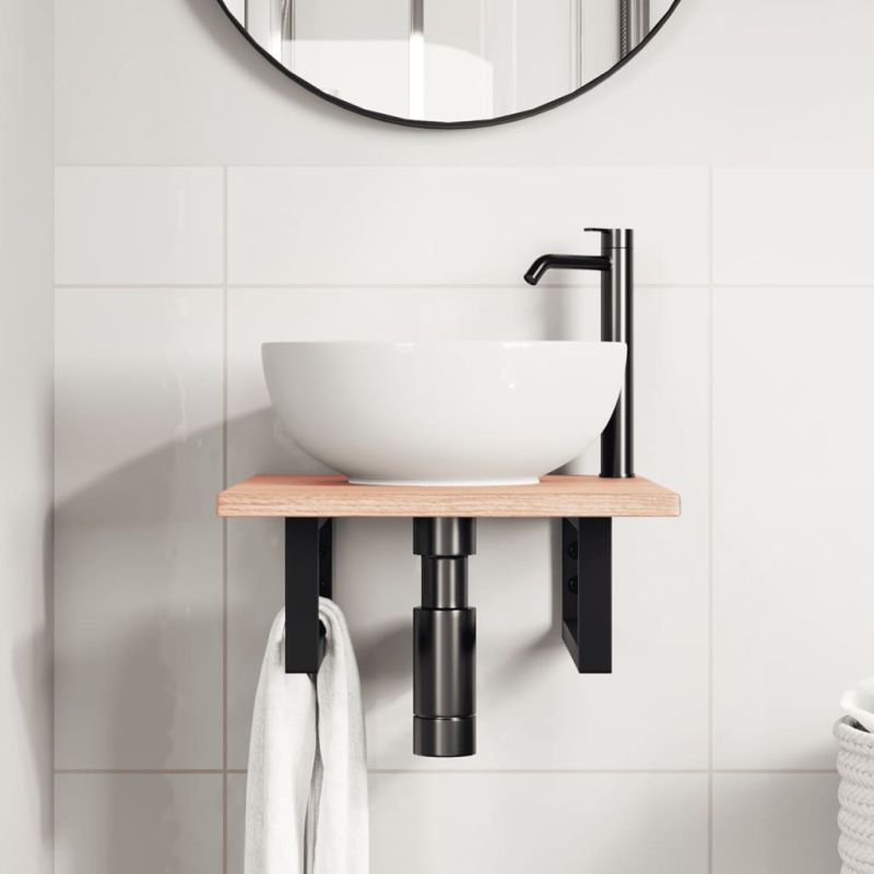 Стенният рафт за мивка се прикрепя сигурно към стената, осигурявайки елегантно и спестяващо място решение за вашата баня. Здрав и дълготраен: Този рафт за мивка е комбиниран със стоманена конструкция и плот от масивна дъбова дървесина, което го прави здрав, стабилен и дълготраен.Спестяване на място: Плаващият рафт за мивка има достатъчно място за съхранение на кремове и дребни предмети. Благодарение на правоъгълната форма можете да закачите кърпи или други неща на опората, за да спестите място.Лесен за използване: Плотът се доставя без дупки, за да позволи на мивката да се монтира отляво, отдясно или в центъра, в зависимост от изискванията на вашето помещение. Благодарение на предварително пробитите отвори в държача, той може лесно да се сглоби с плота и да се монтира на стената.Широки приложения: Благодарение на модерния си дизайн, осигурява допълнително пространство за различни видове бани. Добре е да се знае:Винтовете не са включени, можете да закупите винтовете отделно въз основа на информацията, предоставена по-долу.Прикрепване към стена: 2 бр дюбели M8 на скобаДървен плот: 2 бр M5x18 винта (T=2) или 2 бр M5x20 винта (T=2,5/4 см) на скобаКато естествен продукт, дървото може да има възли и несъвършенства, които ние запълваме с черни пълнежи, за да осигурим гладък външен вид.
