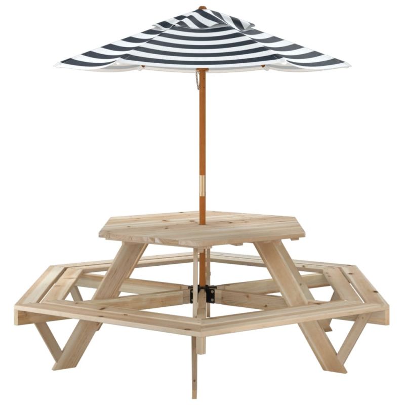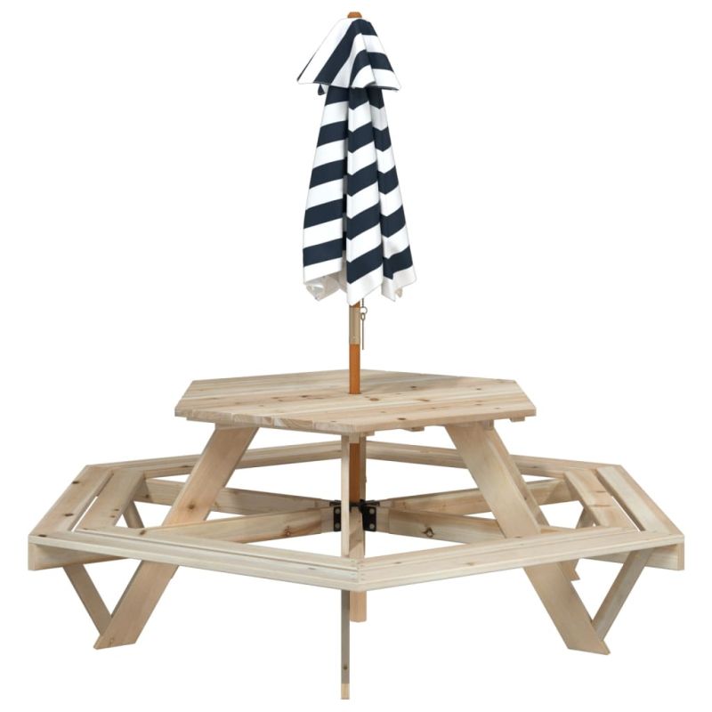 Пикник маса за 6 деца, с чадър, шестоъгълна, чамово дърво масив