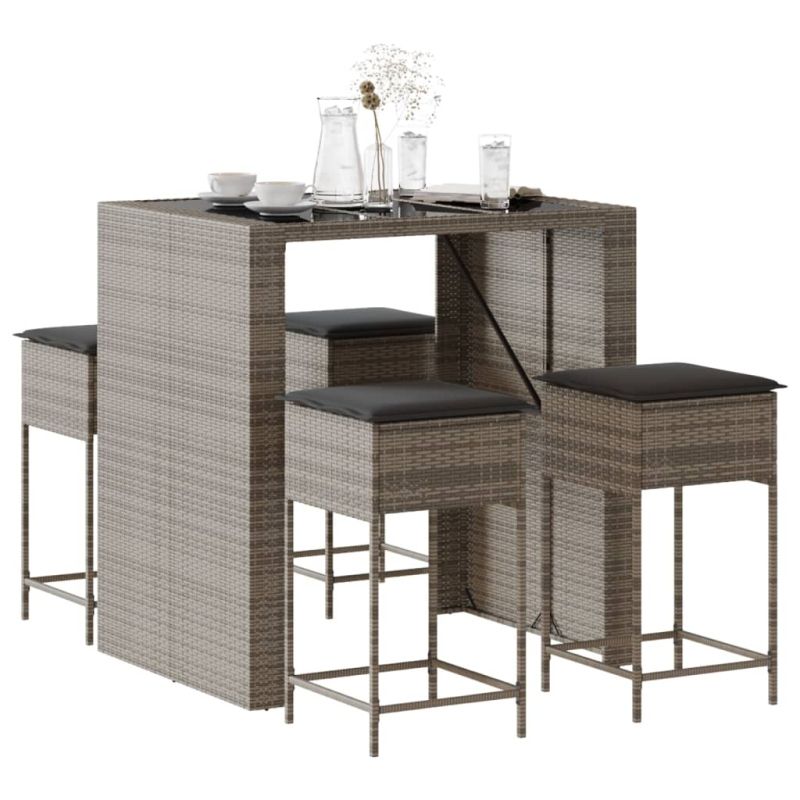 Този модерен градински бар комплект, съчетаващ както стил, така и функционалност, със сигурност е предназначен да бъде центърът на вашата градина, вътрешен двор и всяко друго жилищно пространство. Издръжлив материал: PE ратан, известен също като полиратан, е здрав синтетичен материал с малко необходима поддръжка, който прилича на естествен ратан. Той е лек, лесен за почистване и често се използва за външни мебели поради своята издръжливост и устойчивост на атмосферни влияния.Удобна седалка: Тази мебел за открито, снабдена с плътно подплатени възглавници, предлага удобство при сядане.Калъф, който може да се сваля и може да се пере: Тези възглавници за седалки имат подвижни калъфи за лесно пране и поддръжка.Стъклен плот: Плотът на външната маса е изработен от здраво и издръжливо закалено стъкло, което улеснява почистването с влажна кърпа и добавя нотка елегантност към вашето външно пространство.Здрава и стабилна рамка: Стоманената рамка с прахово покритие гарантира, че градинската мебел е здрава и стабилна за ежедневна употреба на открито. Добре е да се знае:За да сте сигурни, че вашите външни мебели ще останат красиви, ви препоръчваме да ги защитите с водоустойчиво покривало. Максимално 110 кг на седалка.