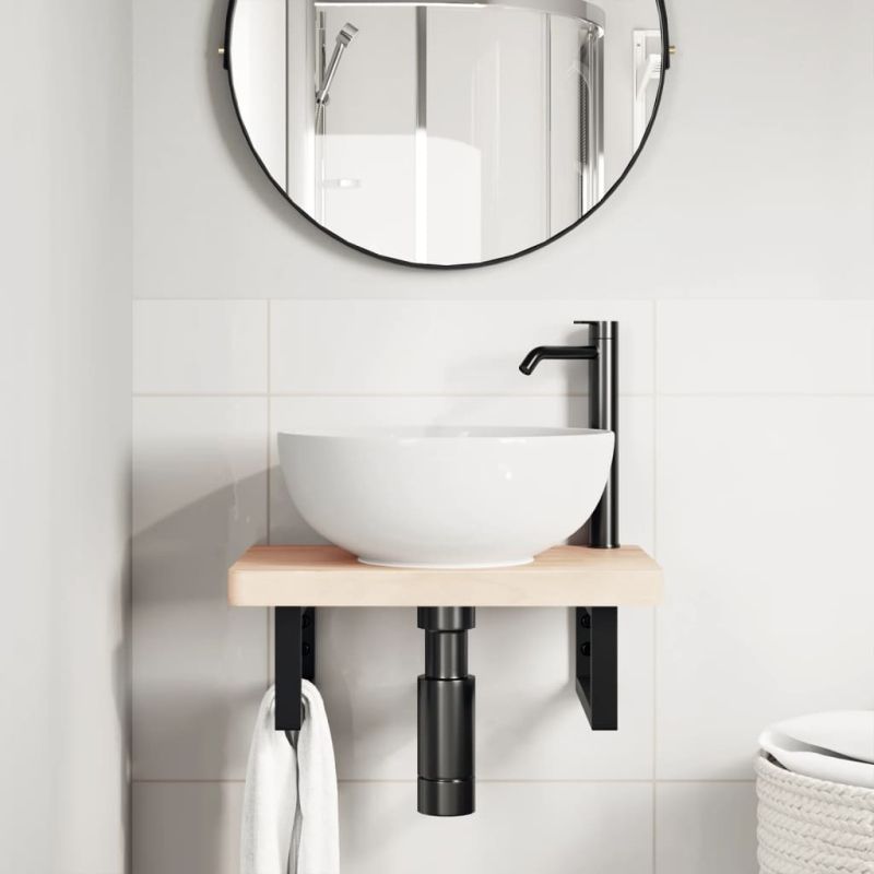 Стенният рафт за мивка се прикрепя сигурно към стената, осигурявайки елегантно и спестяващо място решение за вашата баня. Здрав и дълготраен: Този рафт за мивка е комбиниран със стоманена конструкция и плот от масивна букова дървесина, което го прави здрав, стабилен и дълготраен. Спестяване на място: Плаващият рафт за мивка има достатъчно място за съхранение на кремове и дребни предмети. Благодарение на правоъгълната форма можете да закачите кърпи или други неща на опората, за да спестите място. Лесен за използване: Плотът се доставя без дупки, за да позволи на мивката да се монтира отляво, отдясно или в центъра, в зависимост от изискванията на вашето помещение. Благодарение на предварително пробитите отвори в държача, той може лесно да се сглоби с плота и да се монтира на стената. Широки приложения: Благодарение на модерния си дизайн, осигурява допълнително пространство за различни видове бани. Добре е да се знае:Винтовете не са включени, можете да закупите винтовете отделно въз основа на информацията, предоставена по-долу. Прикрепване към стена: 2 бр дюбели M8 на скоба Дървен плот: 2 бр M5x18 винта (T=2) или 2 бр M5x20 винта (T=2,5/4 см) на скоба
