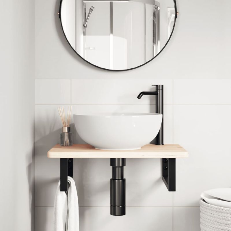 Стенният рафт за мивка се прикрепя сигурно към стената, осигурявайки елегантно и спестяващо място решение за вашата баня. Здрав и дълготраен: Този рафт за мивка е комбиниран със стоманена конструкция и плот от масивна дъбова дървесина, което го прави здрав, стабилен и дълготраен. Спестяване на място: Плаващият рафт за мивка има достатъчно място за съхранение на кремове и дребни предмети. Благодарение на правоъгълната форма можете да закачите кърпи или други неща на опората, за да спестите място. Лесен за използване: Плотът се доставя без дупки, за да позволи на мивката да се монтира отляво, отдясно или в центъра, в зависимост от изискванията на вашето помещение. Благодарение на предварително пробитите отвори в държача, той може лесно да се сглоби с плота и да се монтира на стената. Широки приложения: Благодарение на модерния си дизайн, осигурява допълнително пространство за различни видове бани. Добре е да се знае:Винтовете не са включени, можете да закупите винтовете отделно въз основа на информацията, предоставена по-долу. Прикрепване към стена: 2 бр дюбели M8 на скоба Дървен плот: 2 бр M5x18 винта (T=2) или 2 бр M5x20 винта (T=2,5/4 см) на скоба