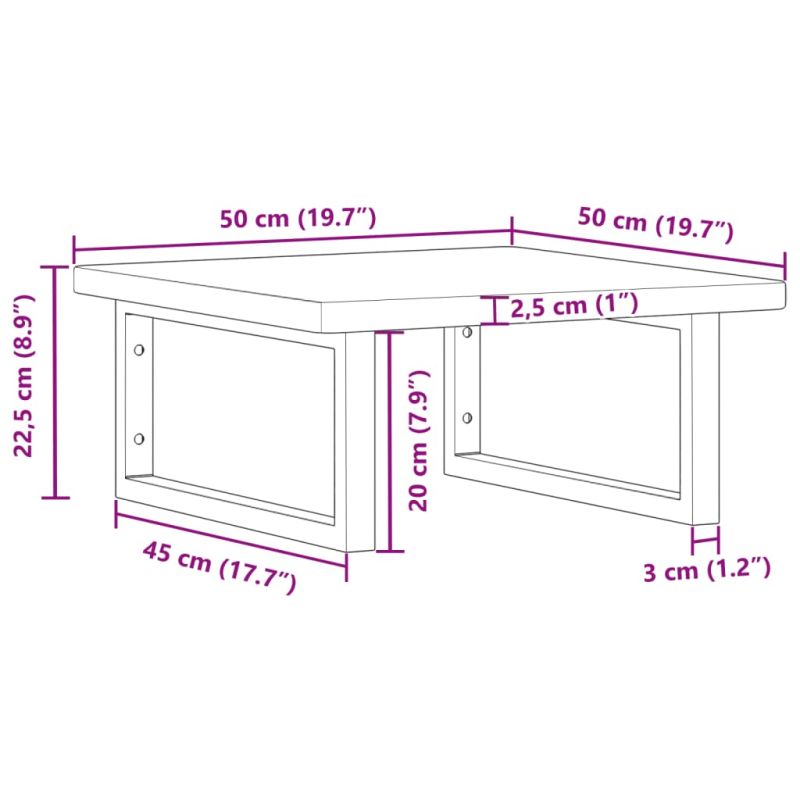 Стенният рафт за мивка се прикрепя сигурно към стената, осигурявайки елегантно и спестяващо място решение за вашата баня. Здрав и дълготраен: Този рафт за мивка е комбиниран със стоманена конструкция и плот от масивна дъбова дървесина, което го прави здрав, стабилен и дълготраен. Спестяване на място: Плаващият рафт за мивка има достатъчно място за съхранение на кремове и дребни предмети. Благодарение на правоъгълната форма можете да закачите кърпи или други неща на опората, за да спестите място. Лесен за използване: Плотът се доставя без дупки, за да позволи на мивката да се монтира отляво, отдясно или в центъра, в зависимост от изискванията на вашето помещение. Благодарение на предварително пробитите отвори в държача, той може лесно да се сглоби с плота и да се монтира на стената. Широки приложения: Благодарение на модерния си дизайн, осигурява допълнително пространство за различни видове бани. Добре е да се знае:Винтовете не са включени, можете да закупите винтовете отделно въз основа на информацията, предоставена по-долу. Прикрепване към стена: 2 бр дюбели M8 на скоба Дървен плот: 2 бр M5x18 винта (T=2) или 2 бр M5x20 винта (T=2,5/4 см) на скоба