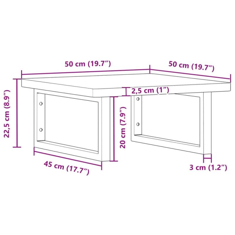 Стенният рафт за мивка се прикрепя сигурно към стената, осигурявайки елегантно и спестяващо място решение за вашата баня. Здрав и дълготраен: Този рафт за мивка е комбиниран със стоманена конструкция и плот от масивна букова дървесина, което го прави здрав, стабилен и дълготраен. Спестяване на място: Плаващият рафт за мивка има достатъчно място за съхранение на кремове и дребни предмети. Благодарение на правоъгълната форма можете да закачите кърпи или други неща на опората, за да спестите място. Лесен за използване: Плотът се доставя без дупки, за да позволи на мивката да се монтира отляво, отдясно или в центъра, в зависимост от изискванията на вашето помещение. Благодарение на предварително пробитите отвори в държача, той може лесно да се сглоби с плота и да се монтира на стената. Широки приложения: Благодарение на модерния си дизайн, осигурява допълнително пространство за различни видове бани. Добре е да се знае:Винтовете не са включени, можете да закупите винтовете отделно въз основа на информацията, предоставена по-долу. Прикрепване към стена: 2 бр дюбели M8 на скоба Дървен плот: 2 бр M5x18 винта (T=2) или 2 бр M5x20 винта (T=2,5/4 см) на скоба