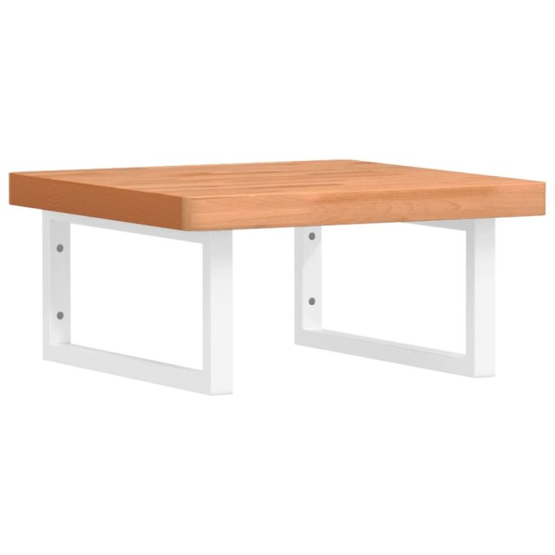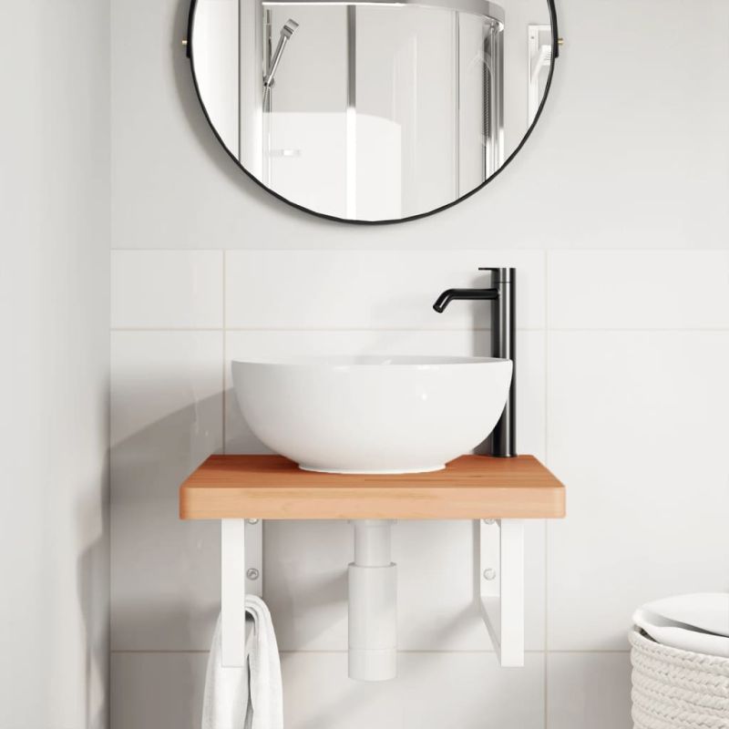 Стенният рафт за мивка се прикрепя сигурно към стената, осигурявайки елегантно и спестяващо място решение за вашата баня. Здрав и дълготраен: Този рафт за мивка е комбиниран със стоманена конструкция и плот от масивна букова дървесина, което го прави здрав, стабилен и дълготраен. Спестяване на място: Плаващият рафт за мивка има достатъчно място за съхранение на кремове и дребни предмети. Благодарение на правоъгълната форма можете да закачите кърпи или други неща на опората, за да спестите място. Лесен за използване: Плотът се доставя без дупки, за да позволи на мивката да се монтира отляво, отдясно или в центъра, в зависимост от изискванията на вашето помещение. Благодарение на предварително пробитите отвори в държача, той може лесно да се сглоби с плота и да се монтира на стената. Широки приложения: Благодарение на модерния си дизайн, осигурява допълнително пространство за различни видове бани. Добре е да се знае:Винтовете не са включени, можете да закупите винтовете отделно въз основа на информацията, предоставена по-долу. Прикрепване към стена: 2 бр дюбели M8 на скоба Дървен плот: 2 бр M5x18 винта (T=2) или 2 бр M5x20 винта (T=2,5/4 см) на скоба