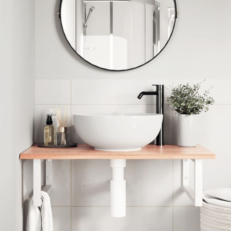 Стенният рафт за мивка се прикрепя сигурно към стената, осигурявайки елегантно и спестяващо място решение за вашата баня. Здрав и дълготраен: Този рафт за мивка е комбиниран със стоманена конструкция и плот от масивна дъбова дървесина, което го прави здрав, стабилен и дълготраен.Спестяване на място: Плаващият рафт за мивка има достатъчно място за съхранение на кремове и дребни предмети. Благодарение на правоъгълната форма можете да закачите кърпи или други неща на опората, за да спестите място.Лесен за използване: Плотът се доставя без дупки, за да позволи на мивката да се монтира отляво, отдясно или в центъра, в зависимост от изискванията на вашето помещение. Благодарение на предварително пробитите отвори в държача, той може лесно да се сглоби с плота и да се монтира на стената.Широки приложения: Благодарение на модерния си дизайн, осигурява допълнително пространство за различни видове бани. Добре е да се знае:Винтовете не са включени, можете да закупите винтовете отделно въз основа на информацията, предоставена по-долу.Прикрепване към стена: 2 бр дюбели M8 на скобаДървен плот: 2 бр M5x18 винта (T=2) или 2 бр M5x20 винта (T=2,5/4 см) на скобаКато естествен продукт, дървото може да има възли и несъвършенства, които ние запълваме с черни пълнежи, за да осигурим гладък външен вид.