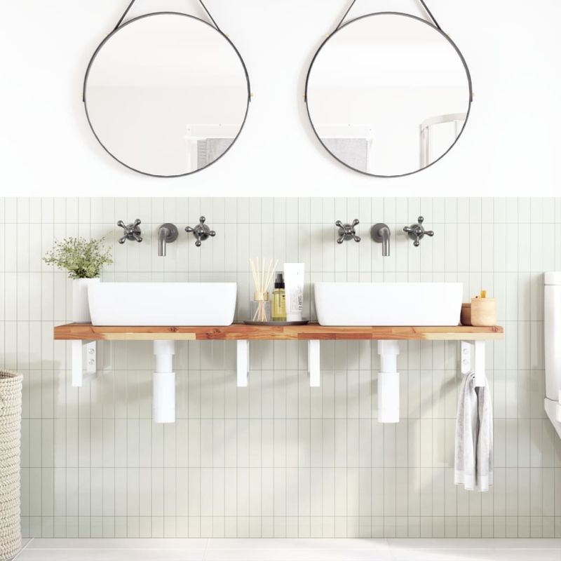 Стенният рафт за мивка се прикрепя сигурно към стената, осигурявайки елегантно и спестяващо място решение за вашата баня. Здрав и дълготраен: Този рафт за мивка е комбиниран със стоманена конструкция и плот от масивна акациева дървесина, което го прави здрав, стабилен и дълготраен.Спестяване на място: Плаващият рафт за мивка има достатъчно място за съхранение на кремове и дребни предмети. Благодарение на правоъгълната форма можете да закачите кърпи или други неща на опората, за да спестите място.Лесен за използване: Плотът се доставя без дупки, за да позволи на мивката да се монтира отляво, отдясно или в центъра, в зависимост от изискванията на вашето помещение. Благодарение на предварително пробитите отвори в държача, той може лесно да се сглоби с плота и да се монтира на стената.Широки приложения: Благодарение на модерния си дизайн, осигурява допълнително пространство за различни видове бани. Добре е да се знае:Винтовете не са включени, можете да закупите винтовете отделно въз основа на информацията, предоставена по-долу.Прикрепване към стена: 2 бр дюбели M8 на скобаДървен плот: 2 бр M5x18 винта (T=2) или 2 бр M5x20 винта (T=2,5/4 см) на скоба