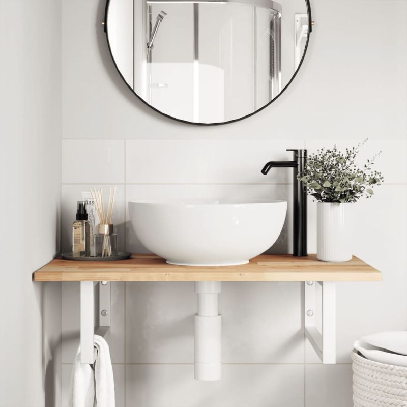 Стенният рафт за мивка се прикрепя сигурно към стената, осигурявайки елегантно и спестяващо място решение за вашата баня. Здрав и дълготраен: Този рафт за мивка е комбиниран със стоманена конструкция и плот от масивна акациева дървесина, което го прави здрав, стабилен и дълготраен.Спестяване на място: Плаващият рафт за мивка има достатъчно място за съхранение на кремове и дребни предмети. Благодарение на правоъгълната форма можете да закачите кърпи или други неща на опората, за да спестите място.Лесен за използване: Плотът се доставя без дупки, за да позволи на мивката да се монтира отляво, отдясно или в центъра, в зависимост от изискванията на вашето помещение. Благодарение на предварително пробитите отвори в държача, той може лесно да се сглоби с плота и да се монтира на стената.Широки приложения: Благодарение на модерния си дизайн, осигурява допълнително пространство за различни видове бани. Добре е да се знае:Винтовете не са включени, можете да закупите винтовете отделно въз основа на информацията, предоставена по-долу.Прикрепване към стена: 2 бр дюбели M8 на скобаДървен плот: 2 бр M5x18 винта (T=2) или 2 бр M5x20 винта (T=2,5/4 см) на скоба