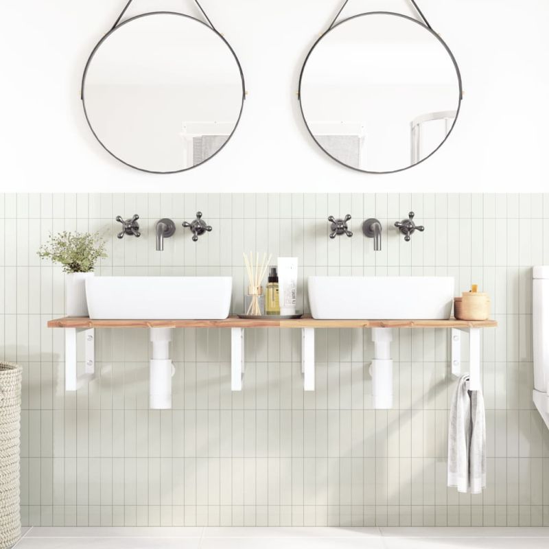 Стенният рафт за мивка се прикрепя сигурно към стената, осигурявайки елегантно и спестяващо място решение за вашата баня. Здрав и дълготраен: Този рафт за мивка е комбиниран със стоманена конструкция и плот от масивна акациева дървесина, което го прави здрав, стабилен и дълготраен.Спестяване на място: Плаващият рафт за мивка има достатъчно място за съхранение на кремове и дребни предмети. Благодарение на правоъгълната форма можете да закачите кърпи или други неща на опората, за да спестите място.Лесен за използване: Плотът се доставя без дупки, за да позволи на мивката да се монтира отляво, отдясно или в центъра, в зависимост от изискванията на вашето помещение. Благодарение на предварително пробитите отвори в държача, той може лесно да се сглоби с плота и да се монтира на стената.Широки приложения: Благодарение на модерния си дизайн, осигурява допълнително пространство за различни видове бани. Добре е да се знае:Винтовете не са включени, можете да закупите винтовете отделно въз основа на информацията, предоставена по-долу.Прикрепване към стена: 2 бр дюбели M8 на скобаДървен плот: 2 бр M5x18 винта (T=2) или 2 бр M5x20 винта (T=2,5/4 см) на скоба
