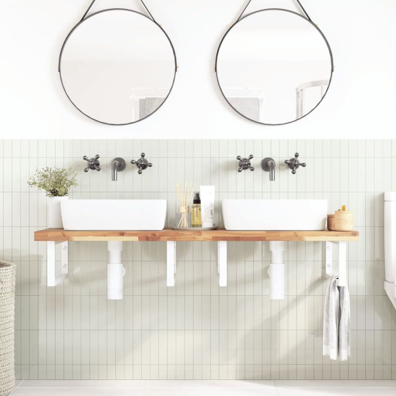 Стенният рафт за мивка се прикрепя сигурно към стената, осигурявайки елегантно и спестяващо място решение за вашата баня. Здрав и дълготраен: Този рафт за мивка е комбиниран със стоманена конструкция и плот от масивна акациева дървесина, което го прави здрав, стабилен и дълготраен.Спестяване на място: Плаващият рафт за мивка има достатъчно място за съхранение на кремове и дребни предмети. Благодарение на правоъгълната форма можете да закачите кърпи или други неща на опората, за да спестите място.Лесен за използване: Плотът се доставя без дупки, за да позволи на мивката да се монтира отляво, отдясно или в центъра, в зависимост от изискванията на вашето помещение. Благодарение на предварително пробитите отвори в държача, той може лесно да се сглоби с плота и да се монтира на стената.Широки приложения: Благодарение на модерния си дизайн, осигурява допълнително пространство за различни видове бани. Добре е да се знае:Винтовете не са включени, можете да закупите винтовете отделно въз основа на информацията, предоставена по-долу.Прикрепване към стена: 2 бр дюбели M8 на скобаДървен плот: 2 бр M5x18 винта (T=2) или 2 бр M5x20 винта (T=2,5/4 см) на скоба