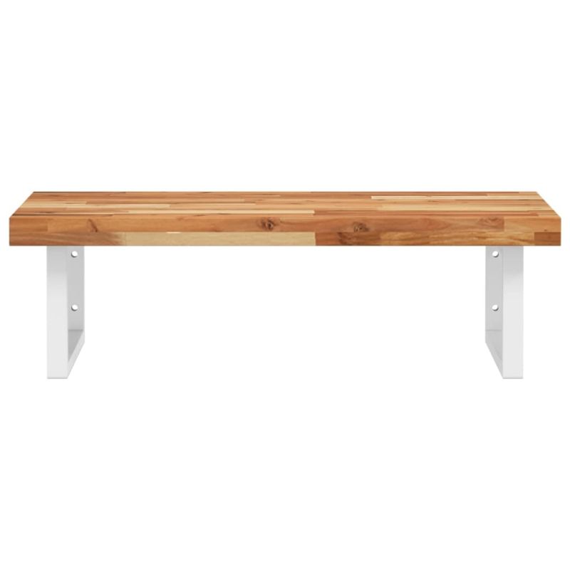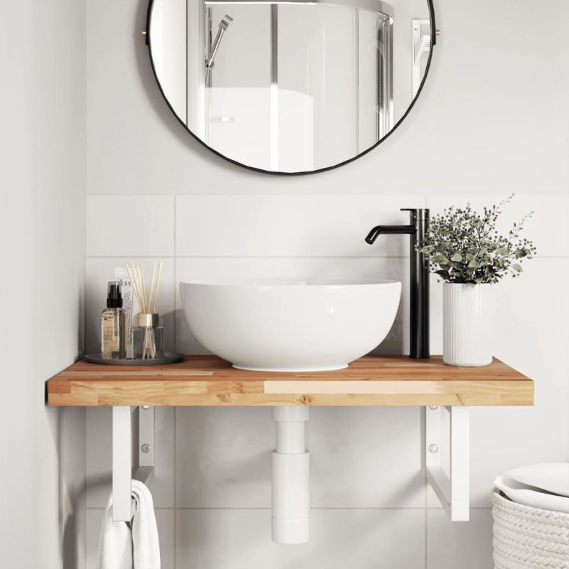 Стенният рафт за мивка се прикрепя сигурно към стената, осигурявайки елегантно и спестяващо място решение за вашата баня. Здрав и дълготраен: Този рафт за мивка е комбиниран със стоманена конструкция и плот от масивна акациева дървесина, което го прави здрав, стабилен и дълготраен.Спестяване на място: Плаващият рафт за мивка има достатъчно място за съхранение на кремове и дребни предмети. Благодарение на правоъгълната форма можете да закачите кърпи или други неща на опората, за да спестите място.Лесен за използване: Плотът се доставя без дупки, за да позволи на мивката да се монтира отляво, отдясно или в центъра, в зависимост от изискванията на вашето помещение. Благодарение на предварително пробитите отвори в държача, той може лесно да се сглоби с плота и да се монтира на стената.Широки приложения: Благодарение на модерния си дизайн, осигурява допълнително пространство за различни видове бани. Добре е да се знае:Винтовете не са включени, можете да закупите винтовете отделно въз основа на информацията, предоставена по-долу.Прикрепване към стена: 2 бр дюбели M8 на скобаДървен плот: 2 бр M5x18 винта (T=2) или 2 бр M5x20 винта (T=2,5/4 см) на скоба