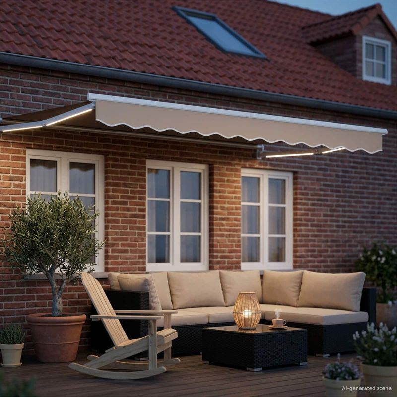 Този ръчен сенник с LED светлини на соларни батерии прави сянка и осветление за тераси, градини и всякакви открити пространства. Може да го нагласите както искате, а соларните LED светлини осветяват всичко вечер, без нужда от контакти. Водоустойчив плат: Изработен е от полиестер с ПУ покритие, за да е устойчив на слънчевата светлина и дъжда. Идеален за често ползване навън! Здрава рамка: Рамката е стоманена и алуминиева, което ѝ дава стабилност, а материалите са устойчиви на корозия. Качеството на конструкцията е на високо ниво! Ръчно управление: Сенникът идва с ръчна дръжка за разтягане и прибирате на сенника, позволявайки ви да регулирате сянката според слънцето. Соларно LED осветление: Има соларни LED лампи, които зареждат през деня за осветление вечер, без нужда от допълнителни захранващи устройства. Инсталационни компоненти: Включен е всичко нужно за поставянето. Следвайте инструкциите и ще го монтирате бързо и сигурно.