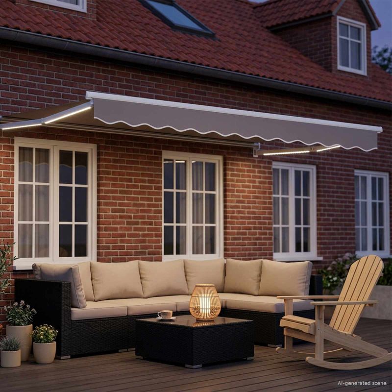 Начало Дом и градина Двор и градина Живот на открито Навеси за врати и прозорци Ръчен изтеглящ сенник с LED светлини Светлосив и бял 3,5 x 2 m