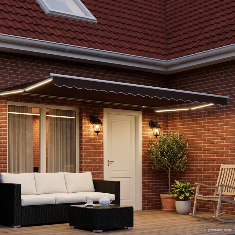 Този ръчен сенник с LED светлини на соларни батерии прави сянка и осветление за тераси, градини и всякакви открити пространства. Може да го нагласите както искате, а соларните LED светлини осветяват всичко вечер, без нужда от контакти. Водоустойчив плат: Изработен е от полиестер с ПУ покритие, за да е устойчив на слънчевата светлина и дъжда. Идеален за често ползване навън! Здрава рамка: Рамката е стоманена и алуминиева, което ѝ дава стабилност, а материалите са устойчиви на корозия. Качеството на конструкцията е на високо ниво! Ръчно управление: Сенникът идва с ръчна дръжка за разтягане и прибирате на сенника, позволявайки ви да регулирате сянката според слънцето. Соларно LED осветление: Има соларни LED лампи, които зареждат през деня за осветление вечер, без нужда от допълнителни захранващи устройства. Инсталационни компоненти: Включен е всичко нужно за поставянето. Следвайте инструкциите и ще го монтирате бързо и сигурно.